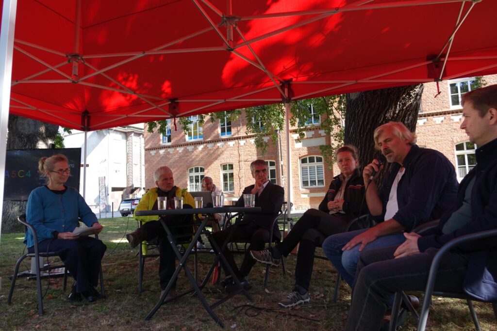 Die Inhalte hatten es dennoch in sich. Regenerative Landwirtschaft, Agroforst, mehr Wald, Renaturierung von Feuchtgebieten, Wirtschaften im Kreislauf der Natur – in einem Vortrag und einer Podiumsdiskussion ging es um Wege, die Lebensgrundlagen in der Altmark zu erhalten. „Das Wissen ist da, es hapert an der Umsetzung“, fasste Moderatorin Aud Merkel am Ende der Diskussionsrunde zusammen. Denn auf der anderen Seite, so verdeutlichte der Austausch der Landwirte Michel Allmrodt und Christian Warnke, der Forstamtsleiterin Nordöstliche Altmark Katja Döge, des BUND-Landesvorsitzenden Dieter Leupold und des Staatssekretärs Dr. Steffen Eichner aus dem Ministerium für Wissenschaft, Energie, Klimaschutz und Umwelt, stehen ökonomische Zwänge und ein Fördersystem, das motivierte Akteure mit seinen Bürokratiemonstern bremst. Die Stimmung blieb jedoch an Lösungen orientiert. Eine davon: mehr Kommunikation miteinander.