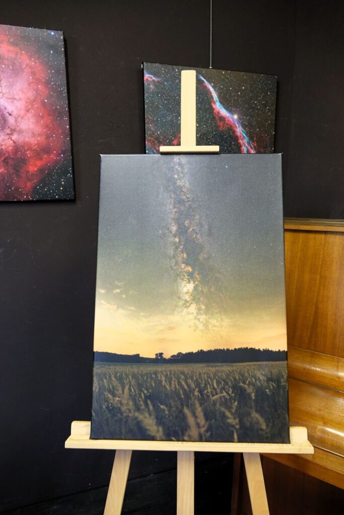 Elf Astrofotografinnen und -fotografen aus Altmark und Wendland zeigen ihre Kunst, mit der Kamera ins Weltall zu blicken – entweder sehr tief, wie Christopher Schramm – oder mit einem Motiv im Vordergrund, von dem sich der nächtliche Himmel abhebt. Beim Tangermünder Jens Ernst beispielsweise ist es die Elbebrücke, der Stendaler Rainer Konrad wählte die Aussichtsplattform in Arneburg. Dem Osterburger Jakob Lessing gelang am Galgenberg in Polkern eine Aufnahme der fast senkrecht stehenden Milchstraße mit interstellarem Staub. Andere Fotografen setzen die Sterne im Zusammenspiel mit Bockwindmühlen, uralten Eichen oder dem Großsteingrab in Stöckheim in Szene. Belichtungszeiten spielen bei dieser Art der Fotografie eine besondere Rolle, und wer es ganz genau wissen möchte, findet in der Kleinen Markthalle einen Katalog mit technischen Angaben.