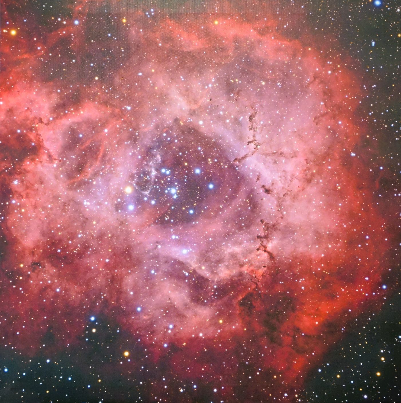 Der Rosettennebel, den Christopher Schramm aus Güssefeld im Sternbild Einhorn aufgenommen hat, wirkt wie ein Gemälde. Doch in der Ausstellung „Sternenklar – auf den Spuren der dunklen Nacht“, die bis zum 8. Mai 2026 in der Kleinen Markthalle gastiert, geht es nicht um Malerei.