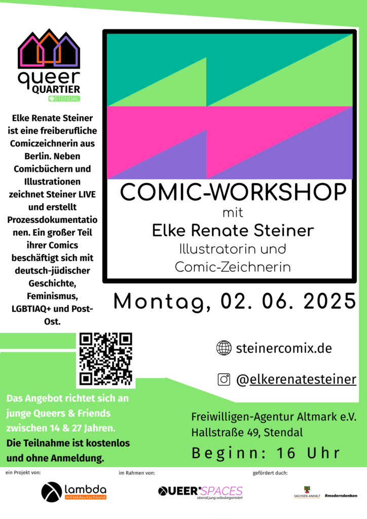 Am Montag, 2. Juni, gibt es eine besondere Edition vom Queer*Quartier in der Kleinen Markthalle: einen Comic-Workshop mit der freiberuflichen Comiczeichnerin Elke Renate Steiner aus Berlin. Neben Comicbüchern und Illustrationen zeichnet sie live und erstellt Prozessdokumentationen. Ein großer Teil ihrer Comics beschäftigt sich mit deutsch-jüdischer Geschichte, Feminismus und LGBTIAQ+. Der Workshop richtet sich an junge queere Menschen von 14 bis 27 Jahren und ihre Freund*innen. Er dauert von 16.00 bis 20.00 Uhr und macht mit einigen grundsätzlichen Techniken des Comics vertraut, z.B. dem Entwickeln von Figuren, dem Zeichnen von Gesichtern und Gefühlsausdrücken sowie der Verwendung von Schrift. Anschließend werden individuelle Kurzgeschichten entwickelt und gezeichnet. Die Teilnahme ist kostenfrei, Material vorhanden. Bei Bedarf kann der Workshop ins Englische übersetzt werden. Eine Anmeldung ist nicht erforderlich.