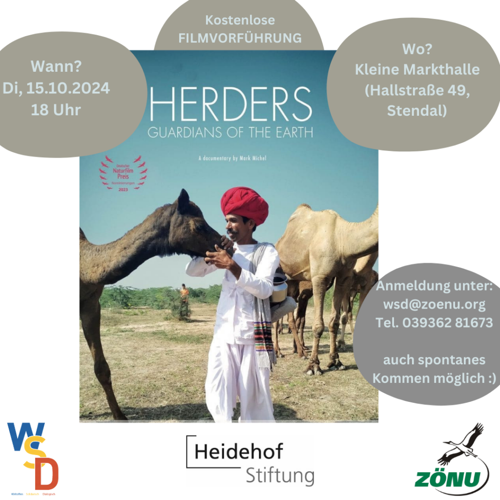 Das Zentrum für Ökologie, Natur- und Umweltschutz ZÖNU zeigt am 15. Oktober um 18.00 Uhr in der Kleinen Markthalle den Film „Herders – Guardians of the earth“ (Hirten – Hüter der Erde). Die Dokumentation von Mark Michel gehörte 2023 zu den Nominierten für den Deutschen Naturfilmpreis. In Landschaften von bemerkenswerter Größe und Schönheit porträtiert der Film die Lebenswelt der oft unsichtbaren und marginalisierten Hirtenkulturen in Peru, Indien, Kirgistan, Deutschland und Uganda. Er fängt die Schönheit und Härte dieser aussterbenden Lebensweise ein, erforscht die tiefen und uralten Partnerschaften zwischen Menschen und Tieren und erzählt von einer Art der Nahrungsmittelproduktion und Lebensweise, die der Natur und der Menschheit mehr zurück gibt, als sie ihr wegnimmt. Der Film ist in den Sprachen Deutsch, Spanisch, Quechua, Kirgisisch, Marwari, Ngakarimojong gedreht und läuft mit deutschen Untertiteln. Eintritt frei.