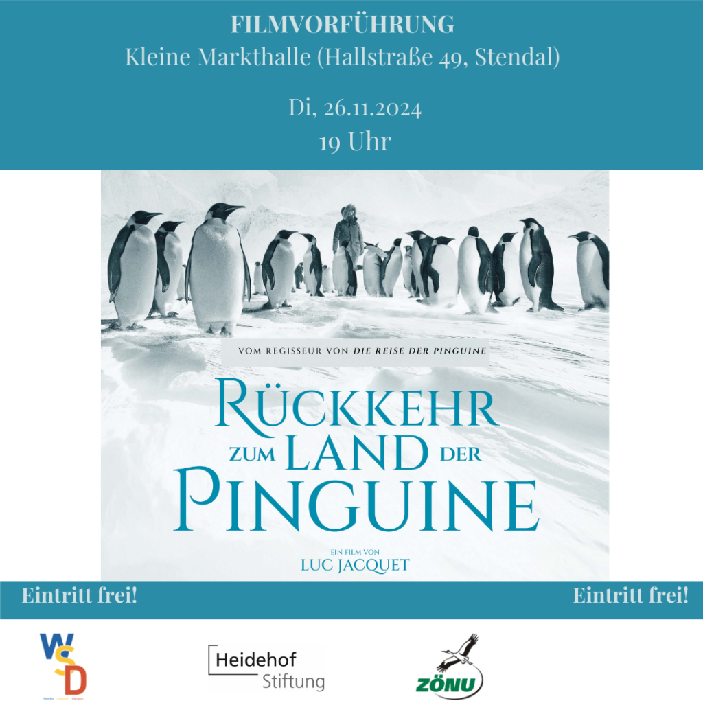 Das ZÖNU veranstaltet am Dienstag, 26. November, um 19.00 Uhr wieder einen Filmabend in der Kleinen Markthalle. Gezeigt wird „Rückkehr zum Land der Pinguine“. Nach dem Riesenerfolg von „Die Reise der Pinguine“ (Oscar® für den Besten Dokumentarfilm) kehrt Regisseur Luc Jacquet in die Antarktis zurück. Die Südspitze Patagoniens ist der Startpunkt für seine Reise nach 90° Süd. Selten hat man die eisigen Küsten und die endlosen, weißen Landschaften der Antarktis so beeindruckend wie in Jacquets filmischem Reisetagebuch gesehen. In großartigen Schwarzweißbildern zeigt er eine fremde und faszinierende Welt aus Eis und Schnee mit ihrer erstaunlich vielfältigen Tierwelt. Der Eintritt ist kostenlos.