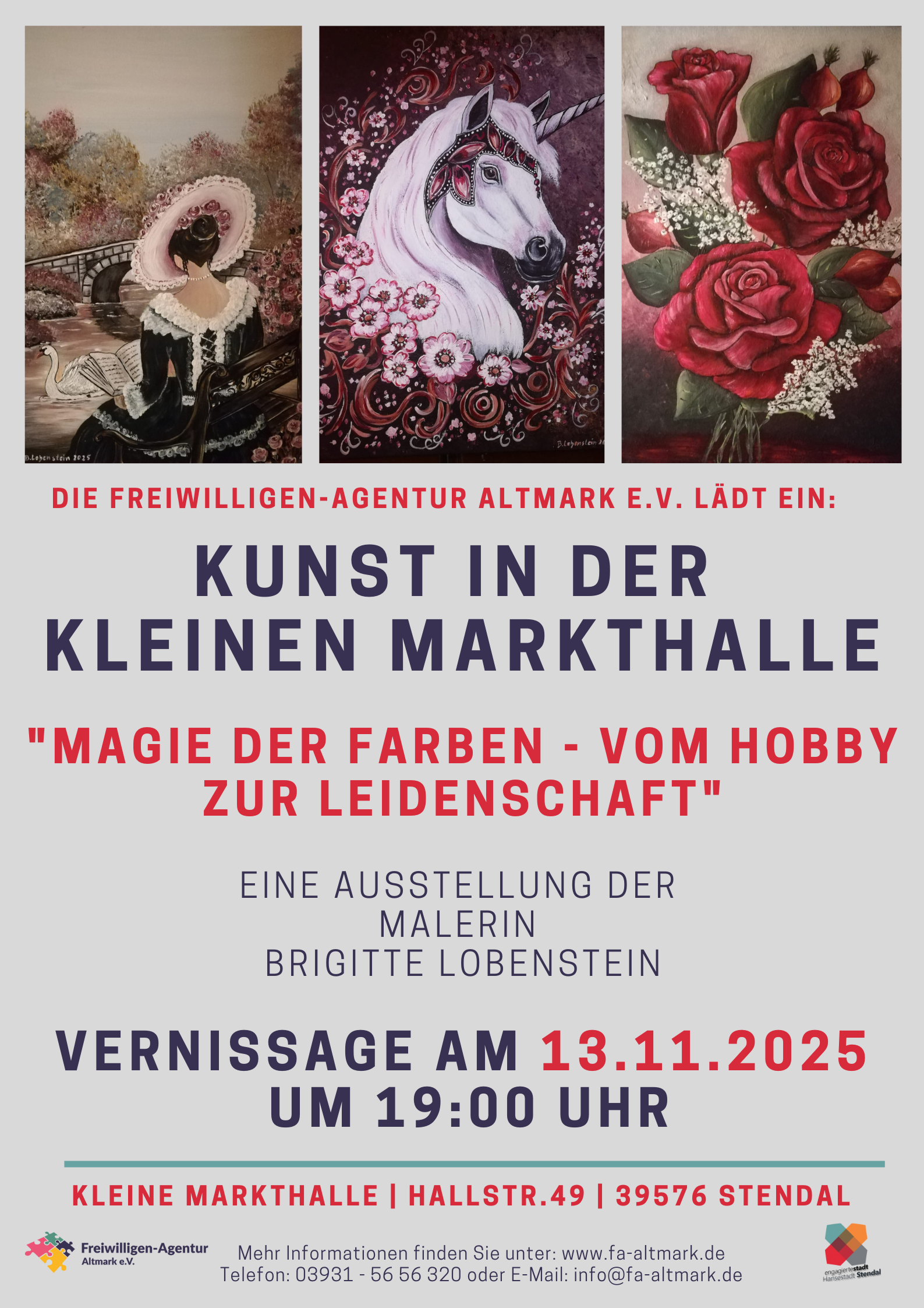 Am Donnerstag, den 13. November 2025, um 19:00 Uhr, lädt die Freiwilligen-Agentur Altmark e.V. herzlich zur Vernissage in die Kleine Markthalle Stendal ein. Mit ihrer Ausstellung „Magie der Farben – vom Hobby zur Leidenschaft“ präsentiert die Malerin Brigitte Lobenstein aus Deutsch ihre Werke erstmals in diesem Rahmen.