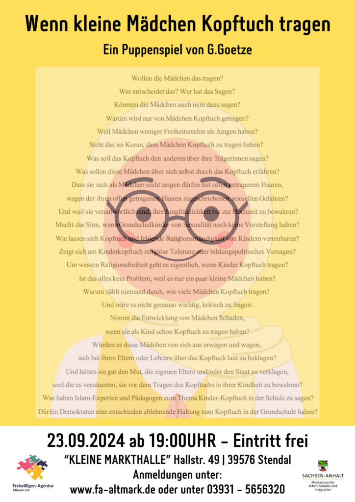 Es geht um die Frage, ob es sinnvoll ist, wenn Kinder in der Grundschule Kopfbedeckungen tragen, die eine religiöse Zugehörigkeit signalisieren (sollen). Konkret streiten sich in meinem Stück eine Großmutter und ihre Enkeltochter über das Kopftuch, das eine Freundin der Enkeltochter trägt. Ihr Streitgespräch wird als Figurentheater präsentiert