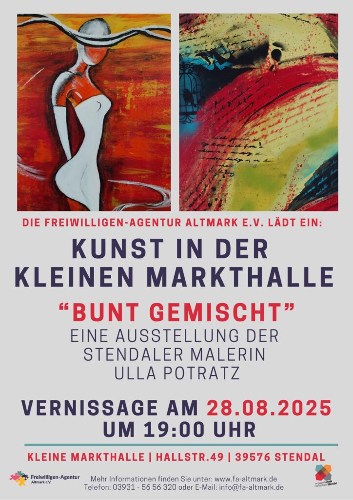 „Bunt gemischt“ geht es zu bei der nächsten Kunstausstellung in der Kleinen Markthalle. Nach einer Werkschau im Jahr 2023 gibt Ursula Potratz erneut einen Einblick in ihr reiches Schaffen. Die in Stendal gut bekannte Malerin legt sich bei Motiven und Techniken nicht fest, arbeitet in Acryl und Öl, mit Bleistift, Fineliner, Pastellkreiden oder auch mal mit Kaffee. Sie probiert immer wieder Neues aus und hat viel Freude an Collagen. Am 28. August um 19.00 Uhr lädt die Freiwilligen-Agentur Altmark zur Vernissage mit Ursula Potratz ein.