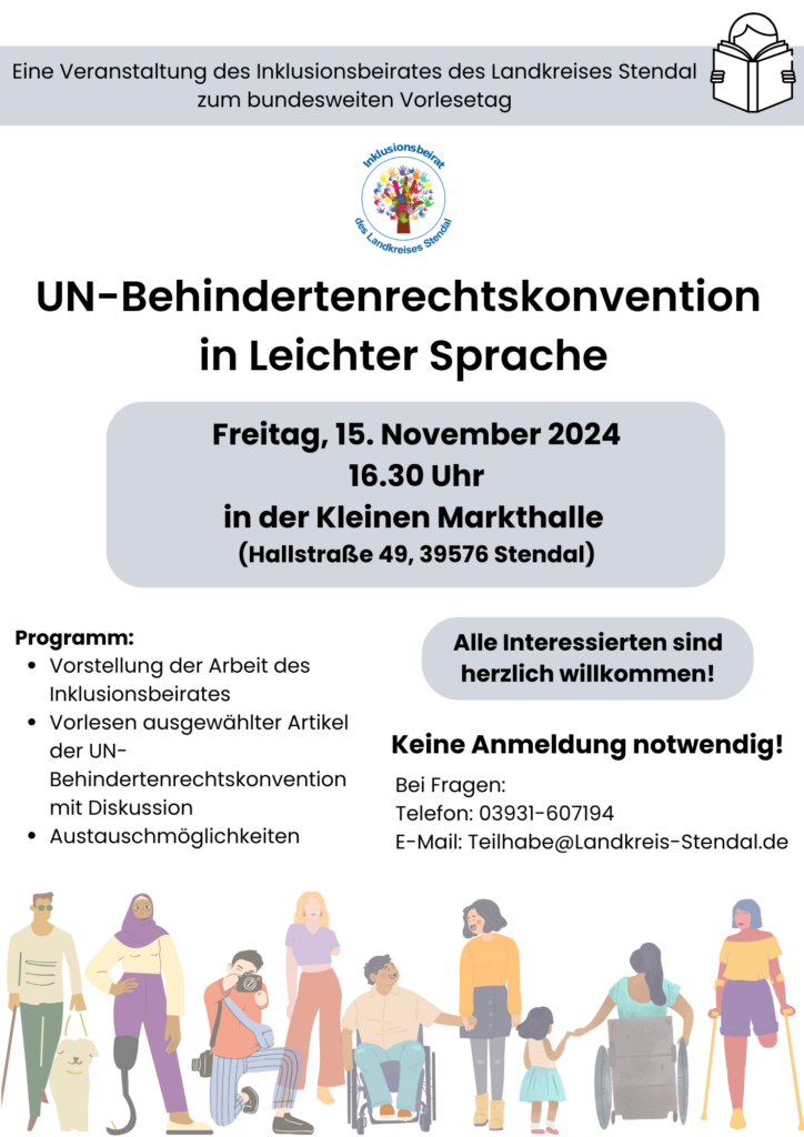 Der Inklusionsbeirat des Landkreises Stendal lädt im Rahmen des bundesweiten Vorlesetages am Freitag, den 15. November 2024, 16.30 Uhr in die Kleine Markthalle (Hallstraße 49, Stendal) ein.
