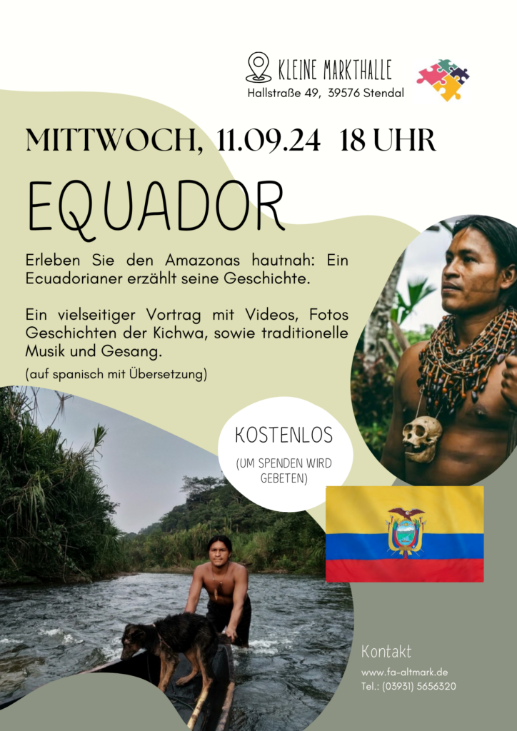 Am Mittwoch, 11. September, ist Chuba Barayuk aus Ecuador in der Kleinen Markthalle zu Gast. Ab 18.00 Uhr stellt er sein südamerikanisches Heimatland vor, das zu den artenreichsten Ländern der Erde zählt. Der junge Mann ist als ältester Sohn von neun Geschwistern das Oberhaupt eines Kichwa Stammes am Rande des ecuadorianischen Regenwaldes. Er wird über das Leben der Kichwa, insbesondere seiner Familie, berichten, die Bedeutung der Pflanzen des Urwaldes erklären, traditionelle Lieder mit Gitarrenbegleitung singen, Zeremonien zeigen und Einblick in Projekte seiner Familie zu Umwelt- und Naturschutz, Tourismus und Forschung geben. Außerdem werden ein Verein zur Unterstützung der Projekte und der Ausbildung von Kindern und Jugendlichen sowie das Crowdfunding vorgestellt. Durch Fotos, Videos, Musik und die authentische Erzählung eines Einheimischen entsteht ein lebendiges Bild vom Leben in Ecuador. Der Eintritt ist frei, Spenden für die Projekte sind willkommen.
